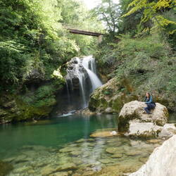Es ist ein sehr aufregender und spaßiger Nachmittag. Der langsamste in der Gruppe ist der junge Ungar, der teilweise statt zu Springen sich lieber Abseilen lässt. Das ist eigentlich vernünftig und sieht trotzdem cool aus, aber wir müssen dadurch im kalten warten. Mit einer Mischung aus schwimmen, springen Abseilen und auf dem Hintern über Felsen rutschen arbeiten wir uns durch den Canyon. Abschluss der Canyoningtour ist ein Sprung aus 7m Höhe den letzten Wasserfall hinunter.