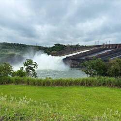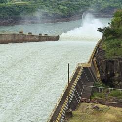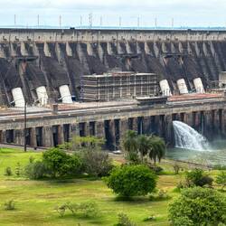 Der Itaipú-Staudamm liegt auf der Grenze zwischen Brasilien und Paraguay. Der Paraná-Fluss wird hier zu einem See von ca 170km Länge aufgestaut. Mit den 20 Turbinen wird eine Nennleistung von 14Baca lagi