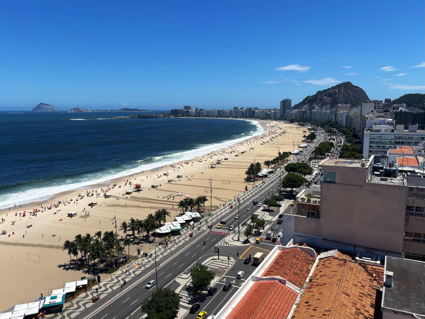 Den Vormittag verbringen wir noch bei 25°C auf der Dachterrasse des Hotels. In Badehose und mit Blick auf die Copacabana.