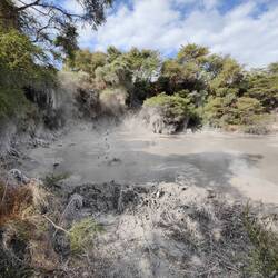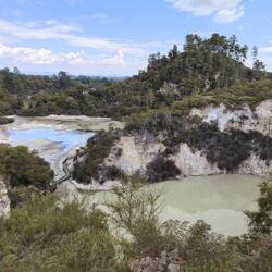 Wir besuchten den Park Wai-O-Tapu (Māori für "heiliges Wasser"), welcher ein aktives geothermales Gebiet am südlichen Ende des Vulkanzentrums von Okataina umfasst und rund 27 Kilometer südlich von Rotorua entfernt liegt🌋. Aufgrund der geothermischen Bedingungen unter der Erde hat das Gebiet neben Geysieren auch Hot Pools, "Terrassen", Krater und viele brodelnde Quellen, die für ihr farbenfrohes Aussehen bekannt sind. Die ersichtlichen Farben ergeben sich aus dem Zusammenspiel zwischen den im Wasser enthaltenen Mineralien und den Licht- sowie Windverhältnissen. Dann gibt es auch etwas weniger hübsche, blubbernde Schlammpfützen 😂.