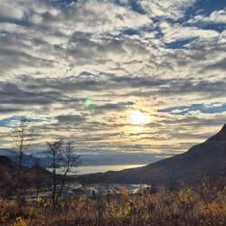 Autumn in the North of NorwayTravelerShow tripAdd to bucket listRemove from bucket listShareDay 3Monday, October 13, 2025 at 3:07 PM ⛅ 5 °C Altitude: 272 m NorwayNarvik68.592693, 17.60300468°35’34” N 17°36’11” ESundown on the way to Narvik October 13 in Norway ⋅ ⛅ 5 °C 2 likes Show trip