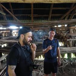 In Viñales haben wir eine Tour durch die Tabakfelder gemacht und besuchten einen Tabakbauer, Nino. Dieser übernahm den Betrieb seines Vaters. Die Tabakbauern müssen 90% der Ernte dem Staat abgeben. Dies ist schrecklich. Bei Nino durften wir auch eine Zigarre ausprobieren. Er zeigte uns gleichzeitig die Herstellung/das Rollen der Zigarre. Je mehr von den obersten Blättern der Tabakpflanze verwendet werden, desto wertvoller wird die Zigarre. Eine gewöhnliche enthält Blätter von allen Bereichen. Er zeigte uns zudem, dass die Zigarre beim Mundstück in Honig getupft werden soll- dies verleiht ihr dann einen süssen Geschmack. Nach dem Besuch bei Nino sind wir zu einer anderen Bauernfamilie. Diese hat uns einen frischen Guavasaft angeboten. Zudem hatten wir bei ihnen auf dem Hügel eine wunderbare Aussicht auf das ganze Tal.