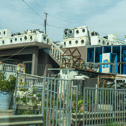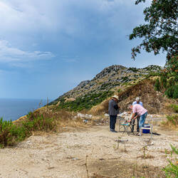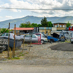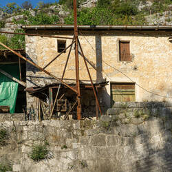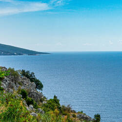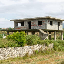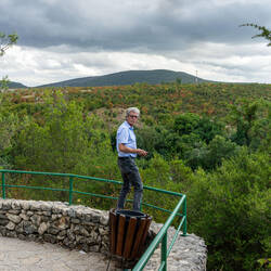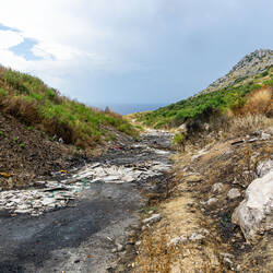 Hier mitten im Müll, direkt oberhalb der Adriaküste, machen wir Rast. Helmut hat von Zuhause Bayrische Salami mitgebracht. Zwar ist rundherum alles voll geschissen, aber es schmeckt trotzdem.