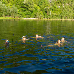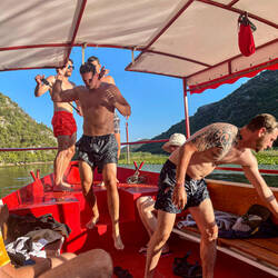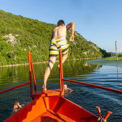 Max. 20 Personen gehen in das Boot. Die Fahrt dauert fast 1,5 Stunden. Und es darf auch geschwommen werden.