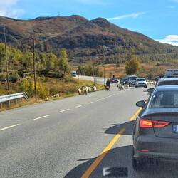 Überhaupt haben wir mit Tieren nicht so viel Glück in diesem Urlaub. Kaum freilaufende Schafe oder Kühe. Und leider auch keine Rentiere auf oder neben der Straße. Nur einmal die Ziegen, die über die Straße getrieben wurden.