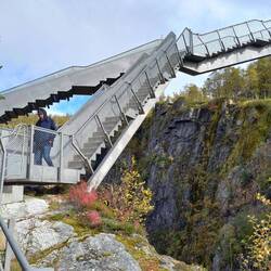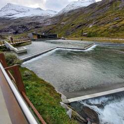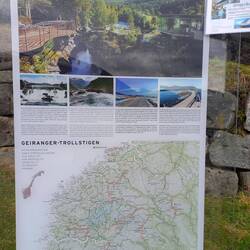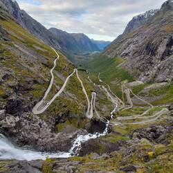 Beim Trollstigen angekommen ist leider alles geschlossen, auch die Toiletten. Der Parkplatz mit seinen 2,3 Boutiken und der Cafeteria macht einen ungemütlichen abweisend Eindruck. Die Sauson ist zu Ende. Sie haben es nicht mehr nötig. Wir lassen uns aber nicht abschrecken und machen den kleinen Spaziergang zu den Aussichtsplattformen, von denen man senkrecht auf die Serpentinen runterblicken kann. Dann nehmen wir die Abfahrt in Angriff. Schön aber nicht sehr viel spektakulärer als beim Geiranger. Und einen Vorteil haben wir: es kommt uns kein einziges Fahrzeug entgegen. In der Saison schieben sich hier die Womos und Reisebusse.