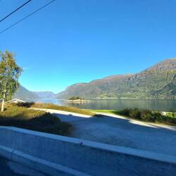 Auf der Rückfahrt nach Gaupne stellen wir fest, dass wir das Dach wohl nicht richtig geschlossen haben. Also kurze Zwangspause. Danach noch ein kurzer Einkauf in Gaupne. Und dann eine extrem schmale Straße (55) am Fjord entlang. Manchmal denke ich, es ist jetzt um die Außenspiegel geschehen. Man muss immer mal wieder anhalten und sich aneinander vorbeischieben. Aber wäre es wärmer käme ich mir vor wie am Gardasee.