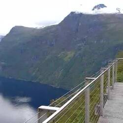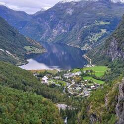 Die Fahrt nach Geiranger ist recht unspektakulär, eine gut ausgebaute breite Straße, die sich durch ein breites Tal schlängelt. Erst kurz vor Geiranger kommen wir wieder auf eine Hochebene. Von dort geht eine Mautstraße auf den Dalsnibba, eine Aussichtsplattform auf einer Bergspitze, von der man bis zum Geirangerfjord blicken kann. Die 280 NOK lohnen sich allemal. Mit jeder Serpentine kommen wir tiefer in den Schnee und der Blick von oben ist phantastisch. Es ist aber auch eisig kalt. Ab 17h wird wegen Schlechtwetter gesperrt, da möchten wir nicht mehr hier sein. Schon so wird mir ganz anders bei den engen Serpentinen bergab. Ein paar Fotos, Bailey darf in den Schnee und Ann-Sophie bekommt als Andenken dicke gefütterte Socken. Dann geht's wieder runter auf die "normale" Straße. Und auch das sind Serpentinen, die es in sich haben. Und immer wieder ein wunderschöner Blick auf Geiranger. Es fehlt heute nur noch ein Kreuzschiff.
