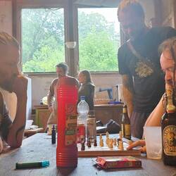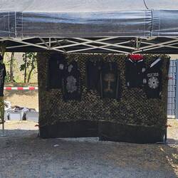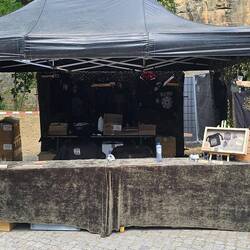 Started the day with merch. I finally have all my equipment, so I was able to try out the new camo nets. It was a bit of a hassle with the location, but I think the merch tent looked really nice inLue lisää