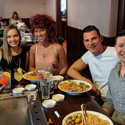 Danach fuhren wir wieder nach Hause. Kurz durchschnaufen und frisch machen und dann mit Ms Lindas Auto zu Kobe‘s. Wir waren da zum Hibachi verabredet mit einer Schulfreundin von Fine und ihrem Mann. Wir aßen sooooooo lecker wieder mal im Hibachi und quatschen etwas. Also eher Fine war ja auch ihre Freundin bzw. hatten die beiden sich viel zu erzählen. Wie fuhren gegen 20:00 Uhr nach Hause und sitzen jetzt schon fast seit 4 Std. zusammen und tun verschiedene Sachen. Lachen, quatschen, fernseh gucken, Bilder und Videos schauen und Rezepte raussuchen. 😅 also ich sag mal Gute Nacht auch wenn wir noch nicht schlafen 😴.