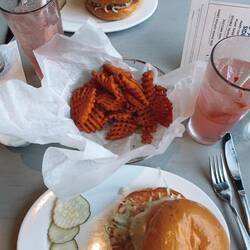 Wir bestellten alle durchweg solch lecker Burger ππ und sweet potato waffle fries π€ͺ geil.