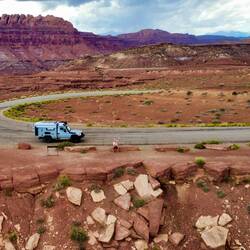 Etwa 250 der insgesamt 380 Kilometer waren pures Kino. Einsame Straßen, grandiose Landschaften, das Gefühl von Freiheit pur. An einem Canyon konnte ich sogar meine Drohne steigen lassen – ein Moment vollkommener Stille und Schönheit. Noch vor ein paar Monaten war ich begeistert von den Schluchten der Anden in Peru – aber was Utah hier abliefert, setzt dem noch eins drauf.