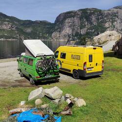 Direkt beim Lysefjord. Leider war der Platz bereits belegt, aber wir fanden trotzdem noch ein gutes Plätzchen in der Nähe. Die Aussicht war richtig schön auf den Fjord und die Felsen. 😊
