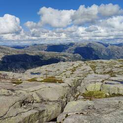 Oben angekommen waren wir ganz schön geschafft, aber erst mal ging es weiter über das kahle Kjeragplateau. Der Weg war steinig und felsig, aber traumhaft schön. Auf der einen Seite sah man unzählige Berggipfel, die sich aneinander reihten. 😍