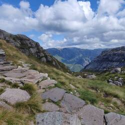 Die Wanderung zum Kjeragbolten umfasst 9,2 Kilometer anspruchsvolle Strecke, die über unwegsames, oftmals ungesichertes Gelände führt. Nur stellenweise ist der Weg mit Eisenketten gesichert. Ca. 650 Höhenmeter sind zu überwinden, es gibt 3 Anstiege, die auch beim Rückweg wieder erklimmt, werden müssen. Das macht die Wanderung wie wir fanden auch sehr anstrengend.
