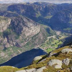 Als wir uns auf den Rückweg machten, hielten wir noch, um mit der Drohne zu fliegen. Später sahen wir einen Wegweiser wo oben stand "Nastind". Wir folgten dem Weg und kamen zu einem Aussichtspunkt. Von dort aus sah man wunderschön auf den Fjord und den Felswänden, die einfach gerade nach unten ragten.