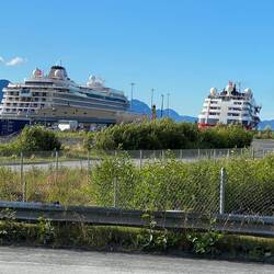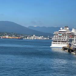 (Almost) Last day, we arrived Vancouver Cruise port around dawn, 2nd photo is dawn breaking as we make the final few miles into the bay. We arrive to see the Norwegian and Disney line ships, that were following us when we did a last deck walk at 21:00 yesterday evening, already berthed at the terminal, presumably they needed to come in first as they needed the 2 larger berths as they are both significantly larger than the Roald Amundsen. We are colour code blue with disembarkation time of 09:00, but preparations started the night before as cases had to be outside cabins at 22:00, requires careful planning on what needs to be in or out of final pack. So at 09:00 we went to the departure point, collected the customs form we had completed and hand in to the ship for checking earlier. Then on into the customs hall where different colour coded (or Disney character) signs stood above lines of cases. Collecting ours we were then lined up with other blues to be lead to another area, where a Hurtigruiten guide ticked us off on his list. At some point I handed over the customs form and was welcomed to Canada. There was then a call for the English speakers. In the Hurtigruiten line to come forward (fortunately Karen chose this time to return from the rest rooms) and we were taken outside to our coach, the cases were whisked away from us and loaded whilst we boarded the coach. At 09:30 we were. Pulling out of Canada Place into the Vancouver traffic for a short city tour. We toured Stanley Park with a stop to see the totems, ( would have been a shorter stop but 2 of the “English” group got back on the “German” bus, eventually the expected numbers on both buses agreed and we set off again, finishing the circuit of Stanley Park, visiting The China and Gas town areas, two of the oldest parts of the city, then onto Granville Island where we had an hour wandering (in circles) around the market stalls before re boarding for the ride out to the airport. Check in was quite painless and priority security was virtually empty so we were through quickly. Some duty free shopping and now in Air Canada lounge with just over 3 hours to go before we are scheduled to take off.