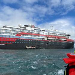 Awake at 02:00, showered, repacked and in hotel lobby with cases at 03:15. Quick dash down 2 escalators (then back up) to pick up breakfast boxes and get on coach for our 3:30 departure for the airport. So 04:00 at the back of a long queue to check in for our charter Alaska Airlines flight to Nome. Spent a lot of the next hour redirect people to the Flair check in desk as they mistakenly thought this was a queue for that check in. A lone young man then joined the queue, when advised it was a charter for Hurtigruten he said that was correct, transpired he is one of the Hurtigruiten cruise designers coming for a test voyage on this ship as he is organising next years voyages for her sister ship the Fridtjof Nansen, which by coincidence is the one we booked on to go to Iceland next year. We had quite a long chat as the queue slowly moved along (had to check all the covid stuff as well as check in), hopefully will see some of my website improvement suggestions next year! Bit nervous that you have to find the single conveyor to put hold luggage on that everyone in the terminal uses, but as we have our luggage the system must work. Another long queue through security and than into an equally long queue for US immigration. As we neared our turn to be seen at one of the visa entry desks, I used the hand sanitiser placed just before you go to a desk. In hindsight this was a mistake, as it then took several attempts and hand drying for my fingerprints to properly register. Anyway 06:00 we are through and accepted into the US only to see the plane was delayed 40 minutes to 7:40 and oddly showing as Anchorage rather than Nome. It transpired the plan was in Seattle and would need to come up to Vancouver, but then the crew had only enough hours left to fly as far as Anchorage and they would mind a new crew for us there. We finally left Vancouver about 8:30. Interesting flight, above the clouds seeing the white tops of various mountains poking through. Adjusting our watches for another hour difference ( now 9 hours behind UK), we finally arrived at 13:00, so we had been on the go for 12 hours! As we boarded one of the yellow school buses sent to pick us up, we were given a sheet of paper with options for the afternoon as apparently we weren’t being taken to the ship for another 4 Hours! Nome doesn’t, look to be a very exciting place, I presume the roads were cement or tarmac, but one couldn’t tell as they basically looked like mud tracks, which also hid the numerous potholes. Karen told the supervisor ( appeared to be some local community group taking care of us) she couldn’t manage that and shortly after a girl from Hurtigruten appeared an said our cabin was ready so we could go straight to the ship. So Karen had the privilege to be the first person registered for the voyage. Actually we were quite useful for them as the reception supervisor used us to help train 6 new crew members on how to process passengers when they arrived, giving each one an iPad and guiding them through the process. Arriving at our cabin the cases were outside waiting for us, shortly after some sandwiches, fruit and juice arrived. We downloaded the app which you have to use to book things ( I.e. restaurant reservations), managed to change the television settings back to English after Karen somehow changed to German. Picked up our expedition jackets (collect boots tomorrow) and found our way to the correct muster point for the lifeboat drill test. Sailed at 07:00, day at sea tomorrow, which might still be today or “tomorrow tomorrow” as we cross and recross the international date lineLes mer