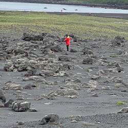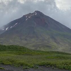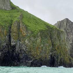Arrived overnight at Chuginadak Island looking at the Carlisle and Cleveland volcanoes. Although a light drizzle, it has just been announced that conditions are currently good enough for a landing, we are second group off this morning so sounds good for us as weather is set to worsen during the day. Going back to yesterday, during dinner we came across a pod of whales, close enough to the ship to see their backs on the surface before they submerged and water spouts. Unfortunately too far away to get good photos by the time we had finished dinner and got to the observation deck, believe Karen has a picture of a water spout as evidence of their appearance. ( FYI - Cleveland is an active volcano having erupted over 22 times in last 230 years. Most recently has erupted 5 times between 2012 and 2017, so hopefully not due to erupt again in the next couple of hours. At breakfast the cloud was around the middle of the mountain so you could see the summit, but by the time I took the picture the top half was totally covered.) Boarding the zodiacs again, my card didn’t work so had to be manually booked off ship. Hitting the beach there was a team to pull the zodiac as far up as follows, As I was at the bow end was first off, swing legs over and drop into sea, and wade the last few step’s ashore, fortunately shallow enough not to go over the boots. It is just before low tide so lots of beach available to walk across, while I say beach it is not sand but is black as covered in fine particles from the 2017 eruption. After walking along the beach we moved inland into a small valley, here there were larger grey and orange stones also the result of the eruption. Didn’t see any wildlife but there were trails of fox footprints all along the beach, the red fox is the only mammal on the island. The walking circuit the guides had mapped out was along the beach up a small grass valley, then around more eruption deposits back to the beach and a walk back to the embarkation point. Coming back the cloud started to clear so better opportunity for volcano photos. Back at embarkation Karen pushed herself forward to get the last place on the zodiac that was there ( did she intend to leave me behind?). But another zodiac was already en-route with another group keen to set foot on the island. So 10 minutes later myself and 3 others were heading back. Appears we were very fortunate, on the previous visit to the island (the south to north version of this cruise) it was too rough to attempt a landing and as we eat lunch we can see the cloud descending and the drizzle starting. The time here is confusing the ship is running 9 hours behind UK, but the island is actually another time zone away (Hawaiian time zone) and my phone has adjusted too that, whilst the iPad is still on Vancouver time - 8 hours behind. ( For those who might have been worried I have been to reception, who confirmed I am registered as being back on board and gave me a new card, hopefully will work the barcode didn’t print very well!)
