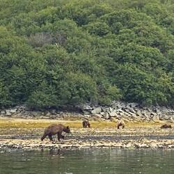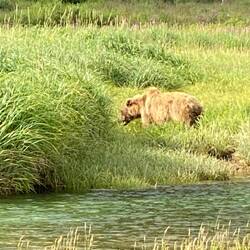 The other bay we visited is the other side of the mountains you see in picture 1, so it only took about an hour after lunch to slowly cruise around the headland into Kinak Bay. But what a marked difference between the two, a strong wind and bigger swell ! But once across the bay and into the channel that took us deeper into the park it was all calm again. Down a narrow channel it eventually opened out into a small lake at the far end amongst the reeds and grasses a bear played hide and seek with us eventually showing enough of him or herself to get a photo. On the way in we noticed a seal swimming back towards the sea, we saw him/ her again on the way back enjoying a fish supper. Karen has photos but have already exhausted my quota of 10 today, so if interested Karen can send separately.Les mer