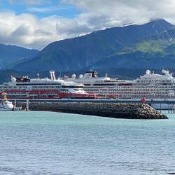 After leaving Kodak we had another encounter with a pod of whales, not close enough to see them breaching, but we watched a constant session of waterspouts for the half hour before dinner. Arriving in Seward this morning, we were told that the stop was just for restocking the ship with supplies, but as we are here for 6 hours a trip ashore was allowed and free entry to the Seward sea life centre was been arranged, providing you were happy to do the 2mile walk. On the way we saw 2 eagles soaring by the mountains, unfortunately my photos only managed to catch one of them. Made the sea life centre an had a quick look around, didn’t stay too long as was busy and the majority were not wearing masks, but did manage a few photos. Coming back, we crossed over a stream heading to the harbour and we able to spot a couple of salmon just above the small weir. Close by was an eagle perched on a lamppost. Then on back to the ship. To give you a comparison our neighbour in the dock is the Viking Orion think this is the ship we saw in Vancouver when we were thereLes mer