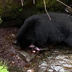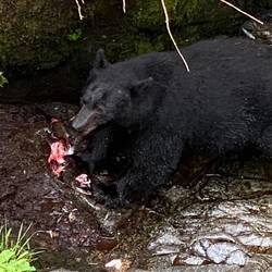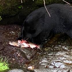 It seems to take the bears so little effort they come to the edge of the river, wade in and only a second or two later leave with a large salmon in their mouths. They appeared to eat very little of the fish they caught, we asked one of the rangers about it and he said this was like phase 2 of their feeding. Phase 1 they eat everything to gain weight, phase 2 they are eating for the oil, so they focus on eating brains, roes and some skin of the salmon, still the bald eagles and other birds are always ready to help finish the plentiful leftovers. Not sure how many black bear pictures/videos we have just a few here, visit if you want to see the full set. Otherwise the eagles were everywhere watching and soaring between the various tree perches around. A brown bear and her cub appeared a short distance downstream where there is a small lake, but the distance does make them difficult to spot against the fallen trees at the point where the stream enters the lake.