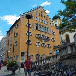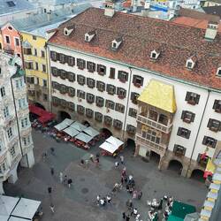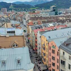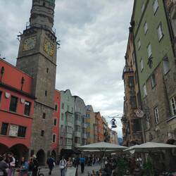 Volvemos en el teleférico de nuevo al centro de Innsbruck (Altstadt) y vamos a la Stadtturm (torre de la ciudad) a la cual se puede subir porque actualmente es un mirador en el centro histórico deLue lisää