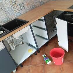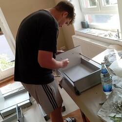 Arbeitsplatte nochmal abgeschliffen und lackiert und dann 40 mal hin und her für die Löcher in der Küchenrückwand.