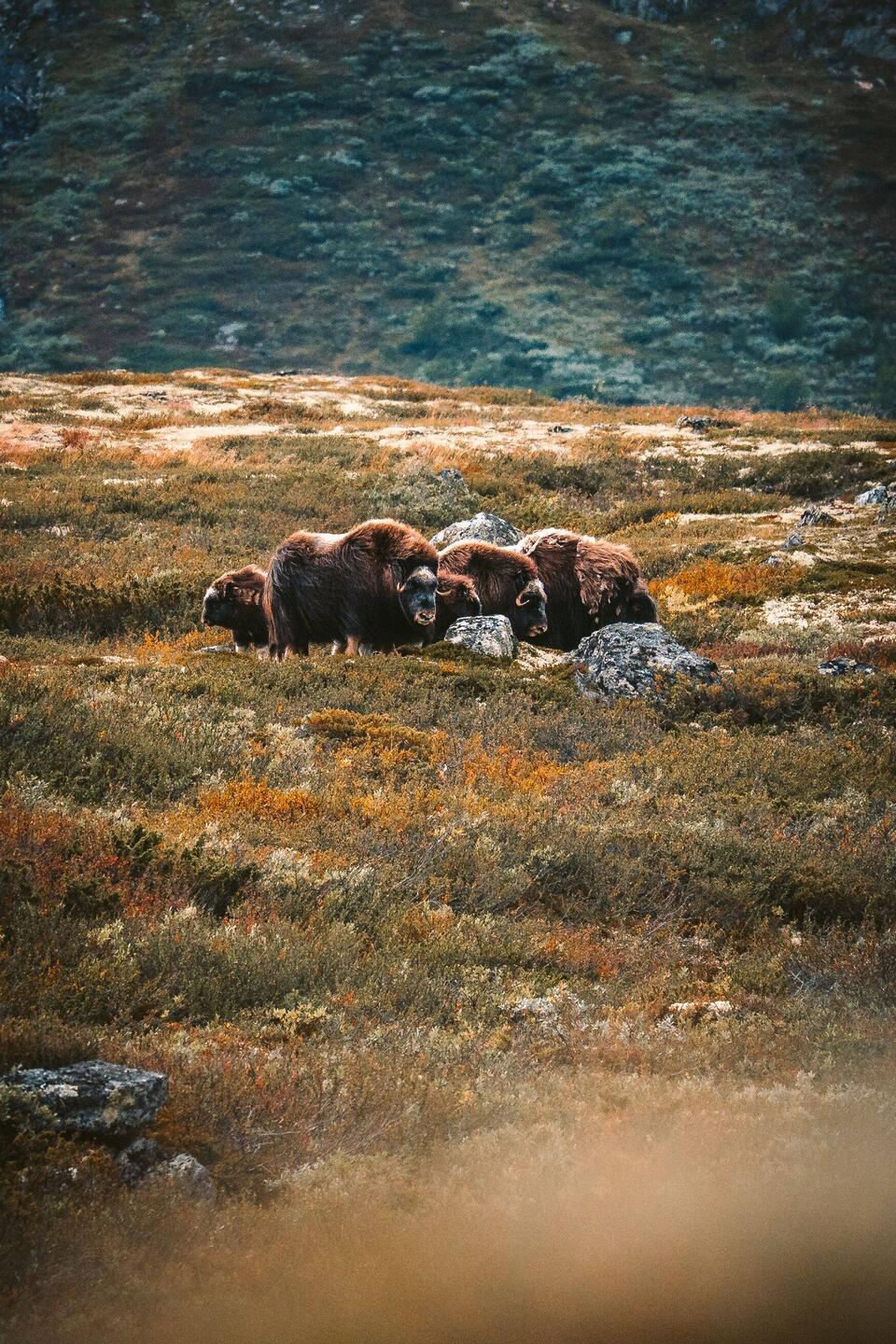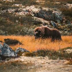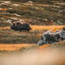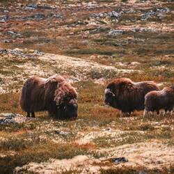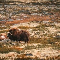 Im Dovrefjell Nationalpark leben ca. 300 wilde Moschusochsen. Der Name und das Aussehen der Tiere könnte vermuten lassen dass sie zu der Art der Kühe zählen, dem ist aber nicht so! Die Ochsen gehören zur Gattung der Ziegen, werden bis 1,50m hoch, bis zu 400kg schwer und können bis 60km/h schnell laufen. Aus diesem Grunde sollte man einen Sicherheitsabstand von 200m einhalten und bei Anzeichen von Aggressionen der Tiere wie das Scharren mit den Hufen oder das Zurückwerfen des Kopfes schleunigst das Weite suchen😡😅 Nach einer Wanderung von wenigen Kilometern durch den Nationalpark entdecken wir schließlich nach einem Hügel eine Familie der imposanten Tiere und nehmen uns einiges an Zeit um diese durch Fernglas und Kamera zu beobachten. Wir sehen wie die Jungen herumtollen und von ihren Eltern zurechtgewiesen werden sowie einige Ochsen die einfach nur ein Nickerchen machen😴 By the way, die Ochsen sind ziemlich faule Schlawiner und bewegen sich nur ca. 2km am Tag😴😂Read more