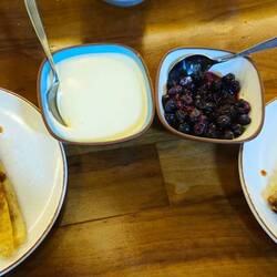 Το γεύμα ξεκίνησε με μας να προετοιμάζουμε τη δική μας σως τσιμιτσούρι. Το πρώτο πιάτο ήταν μελιτζάνα στα κάρβουνα με ένα είδος τυριού. Μετά τυρί προβολώνε με αχλάδι από τα κάρβουνα. Μετά τα λεγόμενα ελληνικά γλυκάδια, αδένες στο λαιμό της αγελάδας που είναι ένα πολύ ακριβό κομμάτι κρέατος γιατί βγαίνει πολύ τραγανιστό απ έξω και πολύ γευστικό και ζουμερό από μέσα (δεν βγάλαμε φωτογραφία). Μετά από αυτό βγήκαν δύο ανοιχτά σαντουιτσάκια, με λουκάνικο αίματος και λουκάνικο τσοριζο. Εδώ και εγώ και η μαμά ζοριστήκαμε για να τα φάμε! Είμαι από τους λίγους στο δωμάτιο που κατάφεραν να τα φάνε και τα δύο. Μετέπειτα μασαλάξαν τα μαχαίρια και βλέπετε τον μάλκολμ να μας προσφέρει το καινούργιο ασημένιο σερβίτσιο, που είναι ουσιαστικά ασημένια μαχαιροπήρουνα ακριβώς όπως τα φτιάχνουν οι γαουτσός καουμπόηδες. Εκεί βγήκε ένα κομμάτι χοιρινού το οποίο το ονομάζουν αυτός που σκοτώνει την πείνα. Επειδή είναι το πρώτο κομμάτι κρέατος το οποίο καταφέρει να ψηθεί στο μπάρμπεκιου. Μετά πέρασε η ώρα και βγήκε το καπνιστό κομμάτι που εξηγεί η βαλεντίνα στο βίντεο. Αυτό ήταν το αγαπημένο μου φαγητό, είχε πραγματικά καταπληκτική γεύση και ένιωθες τον καπνό να γεμίζει όμορφα το στόμα. Μετά βγήκε το ζουμερό κομμάτι από τις μπριζόλες rib eye, που το ονομάζουν φρύδι, γιατί ουσιαστικά καλύπτει την μπριζόλα rib eye. Και σχεδόν ταυτόχρονα η μπριζόλα και πλέον δεν είχα χρόνο να φάω άλλο κρέας! Μετά βγήκε καταπληκτική κρέπα με καραμέλα γάλακτος. Η βαλεντίνα καραμέλωσε το πάνω μέρος της κρέπας με καυτό σίδερο από το μπάρμπεκιου. Η συνοδεία ήταν χτυπημένη κρέμα και μούρα από την παταγονία.Read more