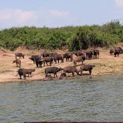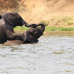 Eine Bootsafari im Kazinga Channel mit badenden Elefanten, die auch gerne mal die Wasserbüffel ärgern 😄