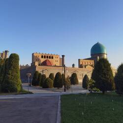 Wir fahren noch die fehlenden 75 km bis Samarqand, der bekannten Stadt an der ehemaligen Seidenstraße. Nachmittags kommen wir an, besichtigen noch das Mausoläum von Amir Timur, dem ehemaligen mongolischen Herrscher dieser Region, und suchen uns dann ein Hotel. Wir finden eins mit Innenhof für unsere Fahrräder, beziehen unser Zimmer und bekommen direkt einen Kirschsaft angeboten, den wir noch trinken.