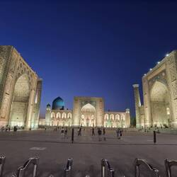 Nachdem wir uns geduscht und ein wenig ausgeruht haben gehen wir in die Stadt, deren Zentrum nur 200 m vom Hotel entfernt liegt. Wir machen uns auf zum Registan Platz, dem bekanntesten Ort Usbekistans. Völlig unwissend dachten wir, das wir kostenlos auf den Platz laufen können. Das ist allerdings schon seit einer ganzen Weile nicht mehr der Fall, denn zu bekannt ist er unter den Touristen. Also gehen wir auf die Aussichtsstufen, die kostenlos zu erreichen und von Menschen überfüllt sind. Hier haben wir uns mit Noel verabredet, der zufällig auch in Samarqand ist. Wir machen einige Bilder vom in der Dämmerung angestrahlten Registan Platz und sehen ihn dann.