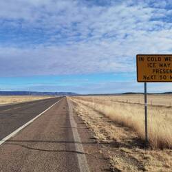 Wir verlassen wieder das Reservat und werden direkt wieder einmal davor gewarnt, dass Schnee und Eis auf der Straße liegen könnten. Quatsch, davon sind wir dann doch noch weit entfernt, denke ich.