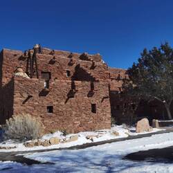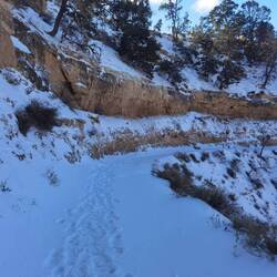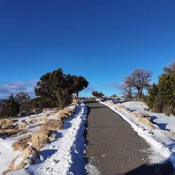 Wir wandern ein Stück des Bright Angel Trails, gehen einen Burger essen um uns bei den -5 °C Tagestemperatur wieder aufzuwärmen und die Schuhe halbwegs trocken zu bekommen und laufen noch den Rim Trail entlang. Dann geht es zurück ins warme Toilettenhäuschen, wo wir wieder zu Abend kochen und am Heißluftfön unsere Füße für die Nacht vorwärmen.