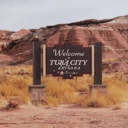 Nachdem wir die Saurierspuren angeschaut haben dauert es nicht mehr lange, bis wir an das Ortsschild von Tuba City kommen. Wie so häufig hier in den Staaten ist auch dieses von Kugeln durchlöchert. Sehr verwundern tut uns das mittlerweile nicht mehr. Ganz interessant ist allerdings das Schild daneben, das auf die Navajo Code Talker des 2. Weltkrieges hinweist. Um Informationen sicher zu übermitteln und nicht zu riskieren, dass die Deutschen oder Japaner diese abfangen, wurde die Sprache der Navajo (Diné) verwendet. So saßen auf beiden Seiten Navajo, die die Informationen in ihrer Sprache übermittelt beziehungsweise auch empfangen haben. So wurde beispielsweise das Codewort "Beshbechahe" (dt. Eiserner Hut; heutzutage eine andere Schreibweise) für Deutschland verwendet und "Nehemah" (dt. Unsere Mutter) für Amerika. Witzigerweise wurden die Franzosen schlichtweg als "Daghahi" bezeichnet, was soviel heißt wie "Bart". Auch das Alphabet wurde mit mehreren Navajobegriffen verbunden. So gab es für den Buchstaben A drei verschiedene Übersetzungen, die variabel genutzt werden konnten. Musste also beispielsweise der Ort "Guadalcanal" durchgegeben werden gab es für den Buchstaben A drei verschiedene Begriffe, sodass der Feind nicht so leicht den Code knacken konnte.