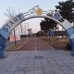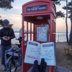Unser Weg führt uns ans Meer zurück, an die Stelle, an der der Hangang River ins Meer mündet. Dort besorgen wir uns unser erstes sepbst gekauftes Souvenir der Tour, den Fahrradpass von Süd Korea. Was aussieht wie ein Reisepass wird organisiert von K-Water, die sich um die Flüsse des Landes kümmern und dafür sorgen, dass diese auch mehr in die Aufmerksamkeit der Menschen rücken. Entlang der größeren Flüsse hat die Organisation Fahrradwege durch das ganze Land gebaut, in einwandfreiem Zustand und bis auf kurze Strecken weit entfernt von Autos. Um mehr Menschen zu motivieren die Radwege zu nutzen wurde der Pass eingeführt. Im Schnitt alle 20 km steht eine alte rote Telefonzelle, in der man sich einen Stempel in den Pass stempeln kann. Hat man alle Stempel eines Radweges gesammelt, erhält man am Ende kostenlos eine Urkunde und kann sich sogar eine Medaille kaufen.