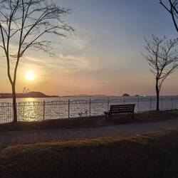 Dann machen wir uns auf den Weg zu Sam, unserem nächsten WarmShowers Host. Dieser wohnt etwas außerhalb von Busan, auf einer kleinen Halbinsel. In seinem 22-stöckigen Hochhaus wohnt er im 18. Stockit Balkon und direktem Blick aufs Meer und den Sonnenuntergang.
