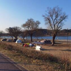 Wir folgen weiter dem Radweg und kommen bald an einem weiteren Campingplatz vorbei. Im Gegensatz zum letzteren ist hier alles andere als gähnende Leere. Alles fängt damit an, dass wir ein paar vereinzelte Zelte mit Erstaunen entdecken. Wow! Wir hätten gar nicht gedacht, dass bei diesen Temperaturen tatsächlich welche campen. Immer mehr Zelte tauchen auf und plötzlich tut sich vor uns etwas auf, das uns kurz aus der Bahn wirft. Rechts und links des Weges stehen duzende Zelte, die meisten dreimal so groß wie unseres. Um die Zelte herum ist ziemlicher Trubel. Stühle und Tische werden aufgebaut, Feuer gemacht, gekocht, Karten gespielt, gelacht oder vollbepackte Handkarren über die Wiese gezogen, aus denen Campingausrüstung hervor quillt. Es ist ein Bild, dass wir so nicht erwartet hätten. Koreaner sind wahrhaft campingbegeistert!