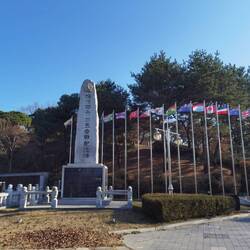 Wir kommen an ein Denkmal, um das mehrere Flaggen herum gehisst sind, unter anderem die türkische, neuseeländische, amerikanische, philippinische und australische. Keine aber steht so im Zentrum wie die griechische Flagge. Als wir die englische Übersetzung lesen, erfahren wir, dass Griechenland das erste Land war, das in den 50ern Süd Korea beim Angriff Nord Koreas zur Seite stand.