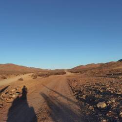 Wir nutzen die Zeit und pumpen meinen vorderen Reifen auf, der etwas mehr Luft vertragen könnte. Als wir da sitzen und derweil auf ein Auto warten, kommt ein Sportwagen angefahren. Wir halten ihn an, um ihn bezüglich der Baustelle zu fragen. Eine wirkliche Antwort bekommen wir nicht, da der Fahrer Italiener ist und deshalb selbst nichts über die Baustelle weiß. Er und sein Sohn sind hier, da der Sohn ein Video vom Auto machen will, wie dieses über die Wüstenstraße heizt. Aus diesem Grund hat der Vater extra die verlassene Sackgasse statt der normalen Straße gewählt.