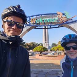Mit uns im Bus sind ein paar Koreaner, von denen uns einer besonders hilft die Fahrräder und Taschen aus dem Bus auszuladen. Er ist sogar so eifrig dabei, dass er in einem Moment einen Koffer eines Mitreisenden übersieht und rücklings darüber in die Bande stürzt und diese und Lukas' Fahrrad zu Boden reißt. Zum Glück ist niemandem etwas passiert und alles wieder schnell in Ordnung gebracht.