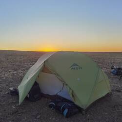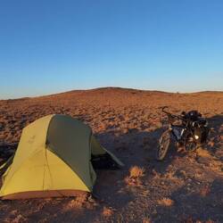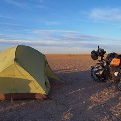 Unser Zelt bauen wir heute hinter einer Hügelkette auf, hinter der wir nicht alleine sind. Unweit von uns entfernt grasen ein paar Kamele und lassen sich das Gestrüpp im Sonnenuntergang sichtlich schmecken.Read more