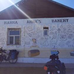Danach machen wir uns gemütlich fertig und brechen dann auf die kürzere Tour für heute auf. Als wir die Räder vor dem Hotel packen, kommen die Empfangsdamen heraus und bieten uns an, unsere Flaschen noch an einem Automaten aufzufüllen und noch Brot mitzunehmen. Da unsere Flaschen schon voll sind, nehmen wir dankend nur das Brot an, das allerdings wie jedes Brot hier leicht gesüßt ist und eher einem Hefekuchen gleicht.