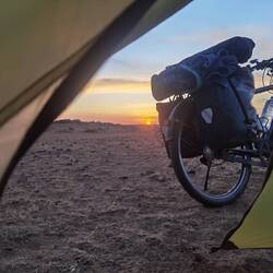 Mit Gegenwind und erst kurz vor Schluss mit Rückenwind geht es weiter. Dann bauen wir das Zelt auf und essen darin zu Abend.Read more