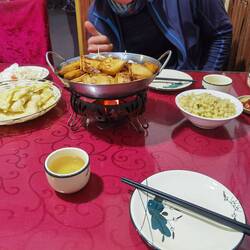 Als wir bei einem unserer täglichen Highlights, dem Mittagessen, dran sind, heute gibt es Dumplings mit Lauch, Ei und Karotten, und wir diese gerade bezahlen wollen, lehnt der Restaurantbesitzer wehement ab und schenkt uns stattdessen das gesamte Mittagessen. "Ausländer bezahlen hier nicht!" tippt er in den Übersetzer ein und ist dann zusätzlich noch sehr interessiert an uns und der Reise. Auch wenn es nicht allzu viele solch schöne Momente hier in China gibt, umso mehr erfreuen wir uns dann an den wenigen, die uns so nett begegnen.