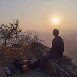 Wir kämpfen uns durch Gestrüpp, klettern übergroße Stufen hoch und kommen dann schließlich an einem der alten Wachtürme an. Dort finden wir schon gleich einen geeigneten Zeltplatz, machen ein bisschen Pause, laufen noch ein Stück weiter, um den Teil der Mauer zu erkunden, kehren dann wieder um und bauen das Zelt auf dem Wachturm auf. Dann essen wir bei leider ziemlich versmoggtem Sonnenuntergang unser Abendessen und bewundern, was die Menschen damals schon alles erbaut haben.Read more