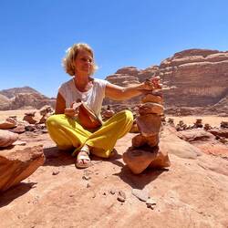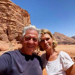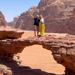 Départ du camp à 10h00 pour une journée de découverte du Wadi, qui est absolument sublime, nous roulons au milieu d’un paysage désertique, de roches sculptées par l’eau, dans des temps immémoriaux. Notre guide nous emmène voir un profond canyon, des ponts de pierre suspendus, les restes de la maison de Lawrence d’Arabie, etc. Nous déjeunons à l’ombre d’une arche de pierre d’un délicieux ragoût de bœuf cuit au feu de bois. Retour au village vers 16h00 pour prendre notre taxi pour Aqaba.