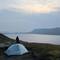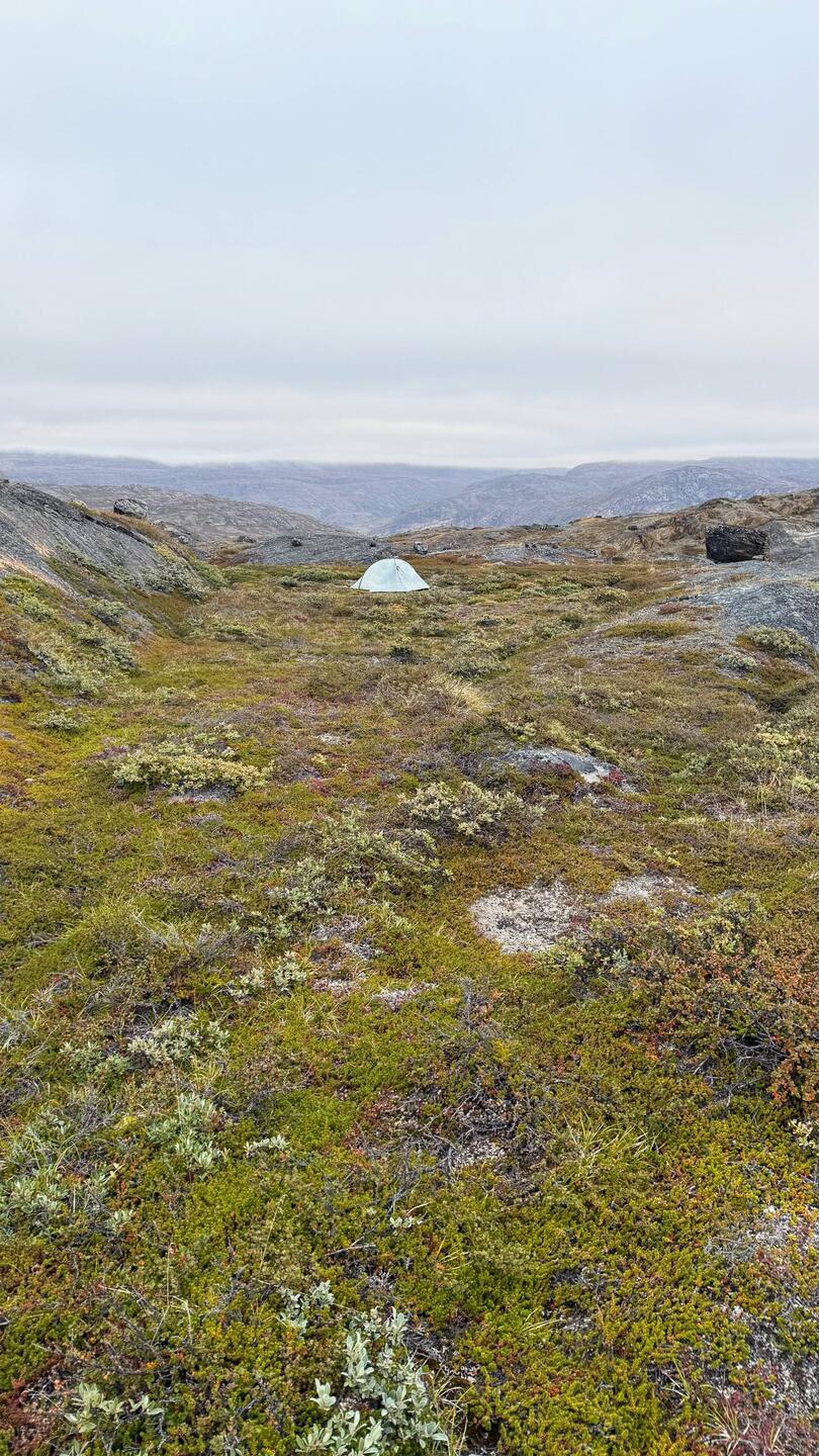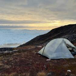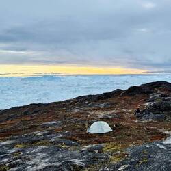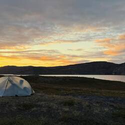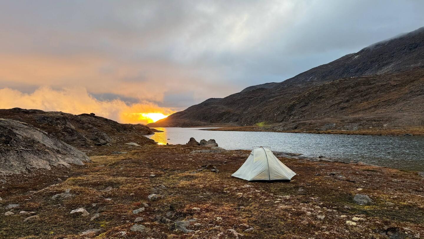 Wir werden müde und unsere Kraft lässt schnell nach. Bis zum Russell Glacier schaffen wir es heute nicht mehr und so beschließen wir unser Lager, hier auf dem Ice Ridge Trail aufzuschlagen. Wir finden unseren ersten Schlafspot genau zwischen zwei Seen. Ein perfekter Ort für eine erste Nacht hier in Greenland. Bis 23 Uhr sitzen wir vor dem Zelt, essen und schlafen dann direkt ein. Die Sonne geht erst kurz vor 23 Uhr unter, auch wenn es dann noch sehr hell ist.