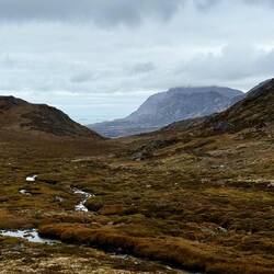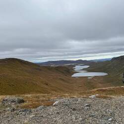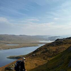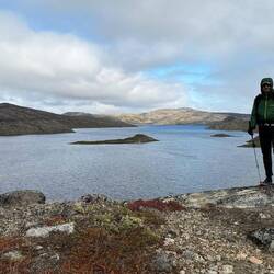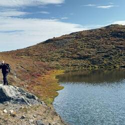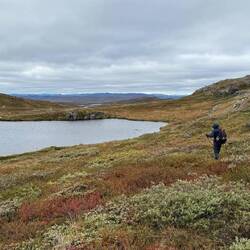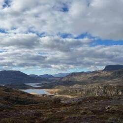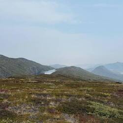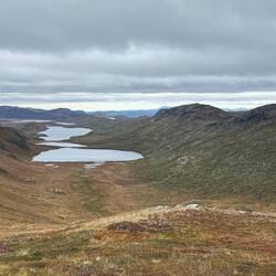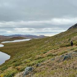 Nochmal hoch auf einen Gipfel und wieder runter. Langsam kommt das Ende des langen Sees näher und wir können Wasser aufnehmen.